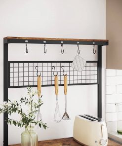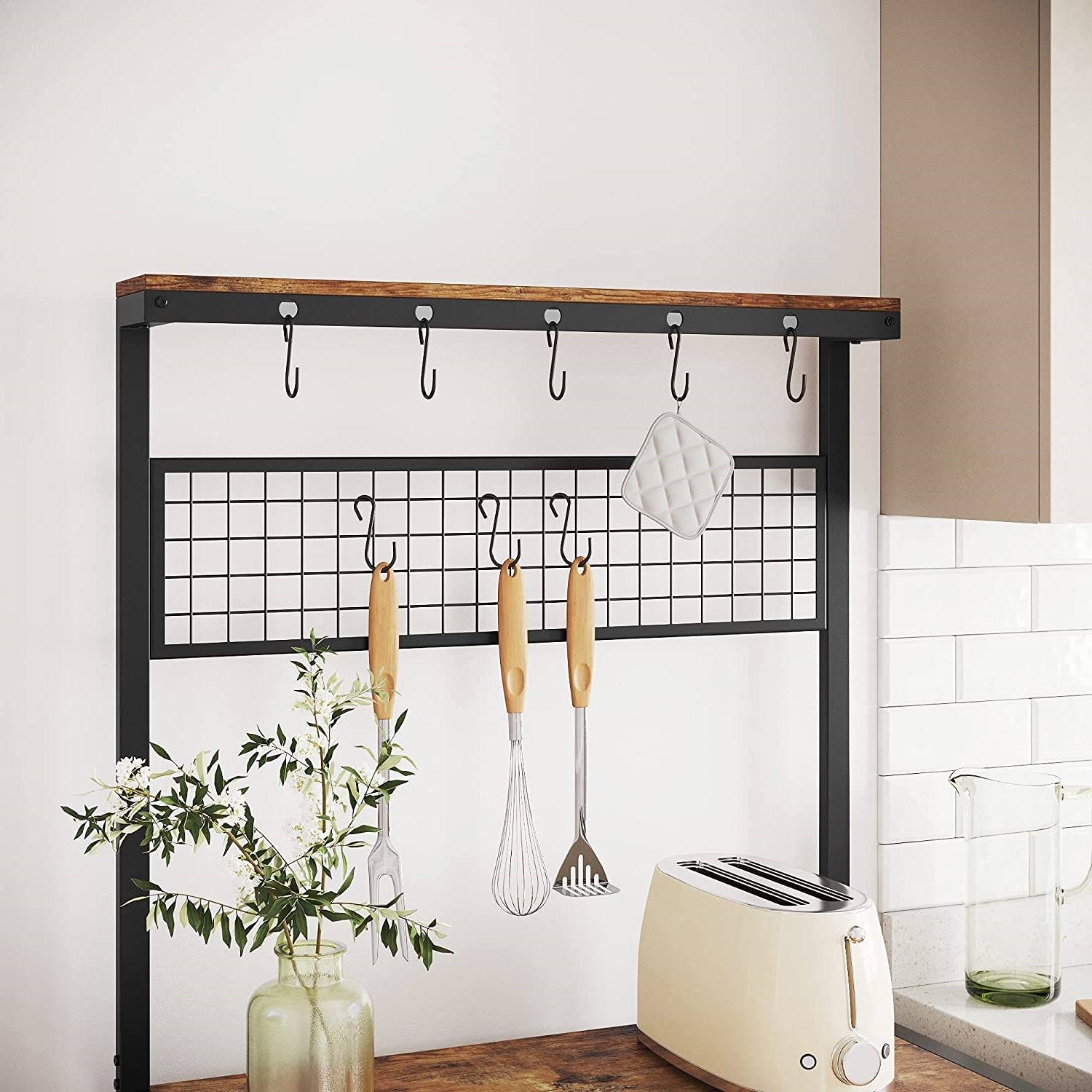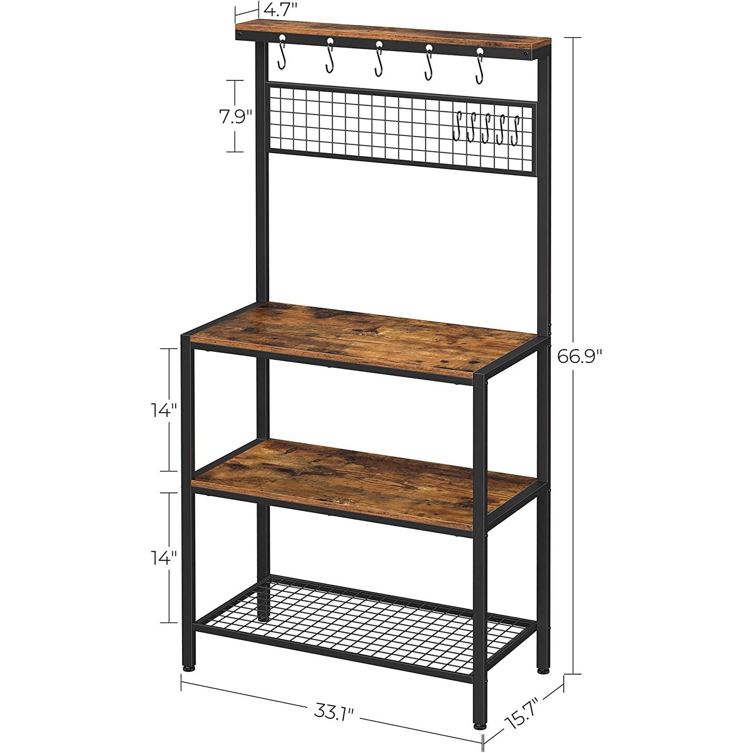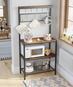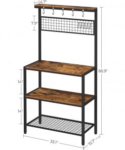 This 3-Shelf Black Metal Rustic Brown Wood Kitchen Baker’s Rack Microwave Stand would be a great addition to your home. Specifications: – Color: Rustic Brown, Matte Black – Material: Particleboard, Iron – Total Size: 33.1″L x 15.7″W x 66.9″H (84 x 40 x 170 cm) – Product Weight: 39.6 lb (18 kg) – Max. Static Load Capacity of Each Wooden Shelf: 66 lb (30 kg) – Max. Static Load Capacity of Metal Mesh Shelf: 44 lb (20 kg) – Max. Static Load Capacity of Each Hook: 6.6 lb (3 kg) – Max. Static Load Capacity of Top Narrow Shelf: 22 lb (10 kg) Package Contents: – 1 x Kitchen Shelf – 10 x Hook – 2 x Anti-Tip Kit – 1 x Accessory Bag – 1 x Instructions Notes: – Avoid long time exposure to strong sunlight. – Avoid contact with sharp or pointed objects. – Please do not place overweight items on the product. – Please fix the product to the wall with the anti-tip kit. If all of these are essential items for you, dont worry! Strong steel frame and quality 15 mm thick chipboard have the strength, so you can put nearly all you need on this kitchen shelf. Place pots on the 3 shelves, customize the mesh panel by hanging cups and potholders, leave ladles and spatulas on the top hooks, and use the top narrow shelf for spice jarsnow it’s up to you! You dont need to an expert on the assembly of this kitchen shelf, as it comes with numbered parts and step-by-step instructions to make it easy-peasy.