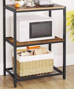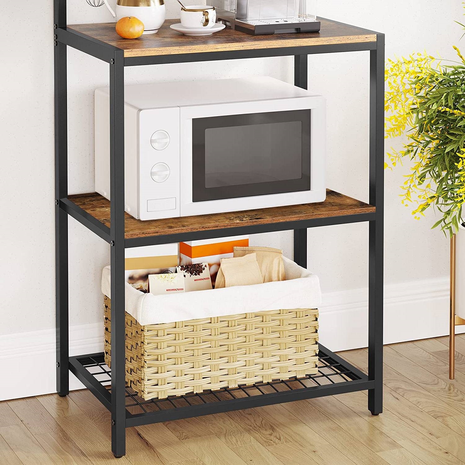 - 3-Shelf Black Metal Rustic Brown Wood Kitchen Baker’s Rack Microwave Stand
