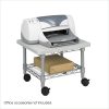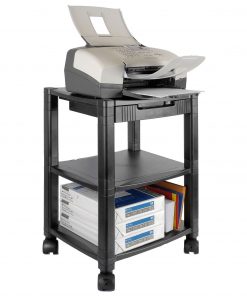 This 3-Shelf Mobile Printer Stand with Organizer Drawer in Black features reinforced shelves that are constructed to accommodate most laser or inkjet printers up to 75 pounds. A built-in organizing drawer is the answer to all of those stray supplies all over the place. The height adjusts in 1.25 inch increments for personal comfort level. Each stand has 4 swivel casters for easy mobility and sturdy metal back brackets for support and safety. Great for use at the office or in the home, the 3-Shelf Mobile Printer Stand with Organizing Drawer provides the versatility needed to make your workday run more smoothly.