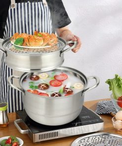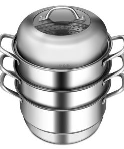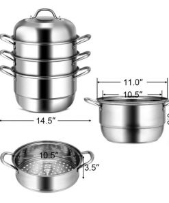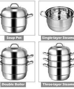 This 3 Tier Large Stainless Steel Steamer Cookware Set is composed of 1 pot, 2 steamer pots, 2 chambers, and a lid, you can use it as a stockpot or combine these components into different steamers. Large cooking space to meet all your daily cooking needs. The multi-layer bottom makes the steamer evenly distribute heat. Transparent tempered glass cover.