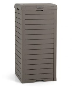 This 31-Gallon Heavy Duty Coffee Brown Plastic Outdoor Trash Can with Bottom Liquid Drawer would be a great addition to your home. Easy cleanup with the pull-out liquid drawer. Long-lasting durability with premium PP material. Weatherproof and fade-resistant properties. Secure trash bags in place with the dual lid closure design. Easy steps for setting garbage bags. Perfect for all settings, including patio, garden, backyard, or indoor room. Effortless assembly and cleaning. Easy to move and transport with built-in handle. Water-proof surface for effortless cleaning and maintenance. Portable case cover for easy open and close lid. Use 33-40 gallon trash bags to fit the trash can.