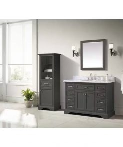 Made with sturdy poplar and finished in a modern grey, this 32-in x 28-in Bathroom Wall Mirror with Grey Solid Wood Frame is a welcomed addition to your home decor. Each mirror features bevel edged glass and pre-mounted hooks for easy installation.