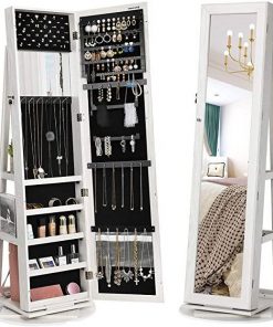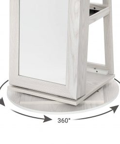 A truly magnificent jewelry collection demands a suitable storage solution. This 360 Degree Swivel White Wash Full Length Mirror Locking Jewelry Storage Armoire is spacious jewelry cabinet is specially designed for jewelry lovers. 14.6”L x 3.7”W x 61”H, it is taller than common cabinets by 13.8”, accommodating over 200 pieces of jewelry. 5 compartments can store perfume, watches, glasses, nail polishes, and much more. 2 shelves and the base can hold your handbag, folded clothes, books, and plants, and more. With a built-in mirror, you can check your makeup and jewelry without turning to the dressing table or closing the door of the jewelry cabinet. The jewelry organizer is safe and reliable due to high-strength fiberboard and lockable design. The cabinet door can be closed tightly with attached magnet.