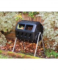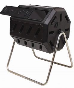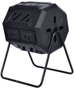 Yimby is an acronym for “Yes in my backyard.” Yimby home and garden products help promote environmental responsibility, sustainability, well being and overall enjoyment of home and garden. This 37-Gallon Tumbling Compost Bin Tumbler Composter – 5 Cu. Ft. features two chambers, fill one side while the other side cures, making it easy to efficiently convert your kitchen and yard waste into rich soil enhancing compost. Just load it up, close the sliding door and use the convenient built- in hand holds to give it a turn every couple days and see how it produces finished compost in weeks. The tumbling composter is made with recycled, up inhibited, black plastic which absorbs heat and is designed to be rodent-proof. Help divert waste from landfill or costly processing and turn your own organic waste into compost in your own backyard.