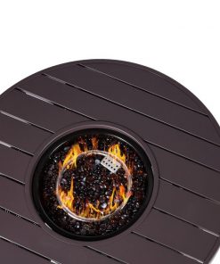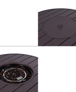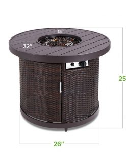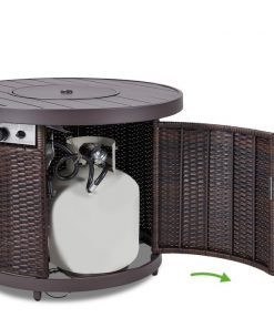 Make your winters warm and cozy with this 50,000 BTU Brown Wicker Round LP Gas Propane Fire Pit w/ Faux Wood Tabletop and Cover. A table free of corners is an ideal option when children are present, while making conversations easier to carry on in a cozier, more intimate setting. Remove the lid from the built-in side hooks and cover the pit to add more space for family and friends to enjoy a light meal, or carefully chow down around a warm fire. Change and conceal your gas tank quickly with a convenient side door; works with a standard 20-pound propane tank at 50,000 BTUs. Propane tank is NOT included. A securing strap also helps prevent shifting. Take off the center lid and ignite an inviting flame over a removable bed of glass beads that trap and disperse heat. A durable nylon cover is included to help ensure this wicker fire pit table with heavy-duty, weather-resistant steel frame will withstand the elements when not in use.