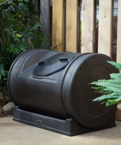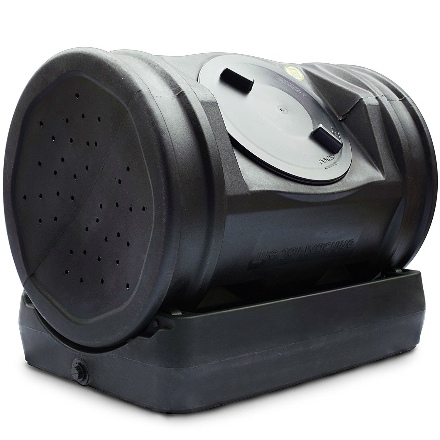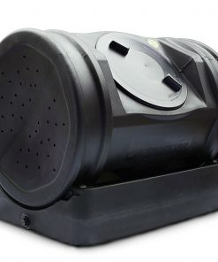 Please welcome the 52-Gallon Compost Bin Tumbler Composter – 7 Cu. Ft.. This little guy is the scaled down version of its 12 cubic foot kin. The Jr. holds 7 cubic feet of compost and sits on a wheeled base. The handles now provide better grip to make turning even easier. The 12-inch twist off lid keeps your compost safely closed off but is easy to remove and even doubles as an extra turning point. The ends feature aeration holes which provide much needed airflow for the compost batch with the option of drilling more for those who live in areas with low air currents. The wheeled base allows owners to turn the bin effortlessly and can easily be separated to allow the bin to roll freely from place to place. The low profile ensures that it stays out of sight and won’t be blown over in high winds like other tumbler composters. The resin material used to mold the bin is 100% recycled and the rich dark color absorbs the sun’s heat keeping your compost at a nice hot temperature. Comes fully assembled and requires little maintenance. Just turn once a week and after addition of new material and you can see compost in as little as 14 days. Help keep organic waste out of our landfills by getting a Compost Wizard Jr. today.