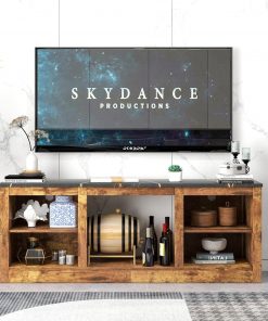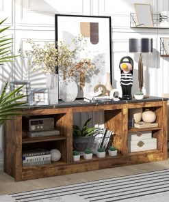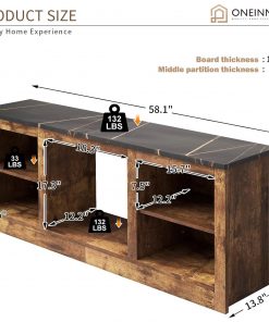 This 58-in Wide by 24-in Tall TV Stand Entertainment Center – for TV up to 65-inch displays a rich and luxurious appearance. The natural patterns and hues of the marble texture add a touch of sophistication to any living room or entertainment area and make each product one-of-a-kind. Overall dimension: 58.1″ L × 13.8″ W × 23.6″ H. It can accommodate TVs up to 65″. 5 open compartments of the TV table stand (no electronic fireplace included) are created for users to store their personal items such as gaming devices, family photos, remote controls and so on. Top of the TV stand is also perfect to place living room sundries. The TV console chooses high quality and thickened PB board as the main material, which provides good stability and durability with up to 132 lbs bearing capacity. Excellent workmanship ensures the overall beauty and refinement. This 58 long TV table is versatile and suitable for different kinds of scenes such as serving as a console table for the living room, bedroom, media room or office. Customers can also regard it as a storage space to display their daily necessities. Setting up the TV stand cabinet is easy for our customers because there are illustrated instructions included in the parcel.