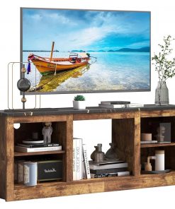This 58-in Wide by 24-in Tall TV Stand Entertainment Center – for TV up to 65-inch displays a rich and luxurious appearance. The natural patterns and hues of the marble texture add a touch of sophistication to any living room or entertainment area and make each product one-of-a-kind. Overall dimension: 58.1″ L × 13.8″ W × 23.6″ H. It can accommodate TVs up to 65″. 5 open compartments of the TV table stand (no electronic fireplace included) are created for users to store their personal items such as gaming devices, family photos, remote controls and so on. Top of the TV stand is also perfect to place living room sundries. The TV console chooses high quality and thickened PB board as the main material, which provides good stability and durability with up to 132 lbs bearing capacity. Excellent workmanship ensures the overall beauty and refinement. This 58 long TV table is versatile and suitable for different kinds of scenes such as serving as a console table for the living room, bedroom, media room or office. Customers can also regard it as a storage space to display their daily necessities. Setting up the TV stand cabinet is easy for our customers because there are illustrated instructions included in the parcel.