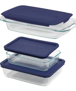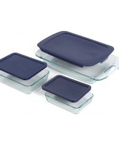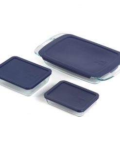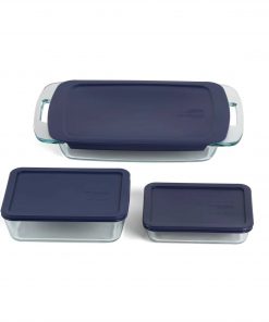 Make baking and roasting fun with the 6-Piece Glass Bakeware Food Storage Set 3 Baking Dishes with Blue Plastic Lids. Each rectangular dish is of different sizes and they can be stacked for easy storage. You can also roast various kinds of meat. Each dish can be safely kept in a microwave, oven, refrigerator, or freezer. They are scratch, stain, rust, warp, and tarnish resistant. This dish can be conveniently cleaned even in the dishwasher as it is dishwasher safe. Made from non-toxic borosilicate glass, the 6-Piece Glass Bakeware Food Storage Set 3 Baking Dishes with Blue Plastic Lids is sturdy and durable. The plastic lid helps keep your food fresh and the set is available in multiple finishes.