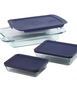 Make baking and roasting fun with the 6-Piece Glass Bakeware Food Storage Set 3 Baking Dishes with Blue Plastic Lids. Each rectangular dish is of different sizes and they can be stacked for easy storage. You can also roast various kinds of meat. Each dish can be safely kept in a microwave, oven, refrigerator, or freezer. They are scratch, stain, rust, warp, and tarnish resistant. This dish can be conveniently cleaned even in the dishwasher as it is dishwasher safe. Made from non-toxic borosilicate glass, the 6-Piece Glass Bakeware Food Storage Set 3 Baking Dishes with Blue Plastic Lids is sturdy and durable. The plastic lid helps keep your food fresh and the set is available in multiple finishes.