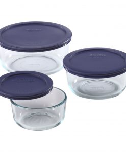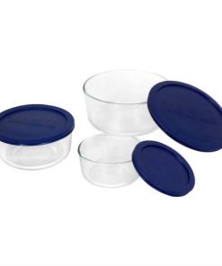 Durable and nice-looking, this 6-Piece Round Glass Food Storage Set with Blue Lids – Made in USA offers a welcome alternative to a cupboard full of plasticware. Made from strong, clear glass, the dishes are great for leftovers, ingredients, or prepared food. They store comfortably in the fridge, warm up in the microwave, and look a lot better than beat-up old plastic pieces at the table. It combines dark blue plastic lids with its reliable glass construction, adding versatility and stackability to the design. This 6-piece set includes three round dishes–2 cups, 4 cups, and 7 cups–and matching lids. Rectangular pieces are also available, and all are safe in the dishwasher for easy cleanup.