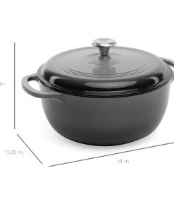 Feed large groups at any occasion with this family-sized Dutch oven that makes up to 6 quarts of casserole, soup, stew, roasts, and endless options! Usable on gas, electric, ceramic, and induction stovetops, in an oven, or even on a grill, it’s perfect for cooking, roasting, frying, or baking your favorite dishes. Safe to heat up to 480 degrees Fahrenheit, with evenly distributed condensation bumps on the lid’s interior and a tight seal to keep moisture, heat, and flavor inside the pot. Made of thick, heavy-duty cast iron with a glossy enamel finish and white, non-stick enamel interior, it has exceptional heat conduction, retention, and distribution for reliable cooking. Two side handles allow for easy handling, and the non-stick finish means you can hand wash it without the rough scrubbing