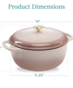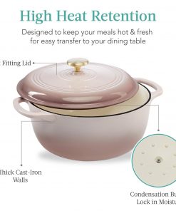 Feed large groups at any occasion with this family-sized Dutch oven that makes up to 6 quarts of casserole, soup, stew, roasts, and endless options! Usable on gas, electric, ceramic, and induction stovetops, in an oven, or even on a grill, it’s perfect for cooking, roasting, frying, or baking your favorite dishes. Safe to heat up to 480 degrees Fahrenheit, with evenly distributed condensation bumps on the lid’s interior and a tight seal to keep moisture, heat, and flavor inside the pot. Made of thick, heavy-duty cast iron with a glossy enamel finish and white, non-stick enamel interior, it has exceptional heat conduction, retention, and distribution for reliable cooking. Two side handles allow for easy handling, and the non-stick finish means you can hand wash it without the rough scrubbing