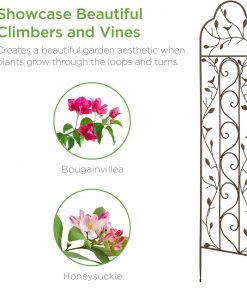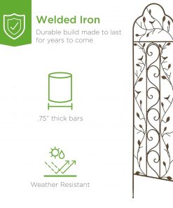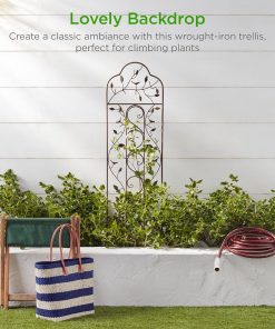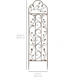 This 60-inch Tall Outdoor Iron Garden Trellis in Bronze Metal Finish has leaf, stem, branch, and bird details flow in a beautiful scroll design for the perfect decorative piece for your yard, garden, or outdoor walkway. Crafted with a tough welded iron design, this rustic piece has a weathered finish to make it a mainstay in your yard for years to come. Grow all sorts of climbing plants, like climbing roses and passion vines, to create a quintessential backdrop for the perfect garden. Ideal for subtle or standout decoration, this garden essential can be grouped with multiple trellis sections to create a lovely yard divider. Made with spiked legs for easy ground staking, this trellis can be placed in just seconds!; OVERALL DIMENSIONS: 15.5″(L) x 0.75″(W) x 59.25″(H).
