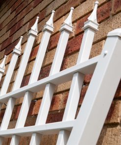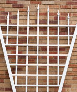 The 7.75 Ft Fan Shaped Garden Trellis with Pointed Finals in White Vinyl gives support to climbing flowers and vines, while the pointed finials add a classic touch. Climbing flowers and vines will also create just the right amount of privacy to your walkway or garden. This trellis is constructed of high-grade PVC vinyl that carries a 20-year warranty. It is durable and maintenance-free, too. UV stabilizers protect the vinyl from harmful ultraviolet rays, so it will not fade over time. As an additional bonus, this trellis will never need painting. Includes four wall-mounting brackets.