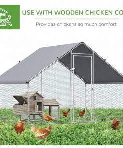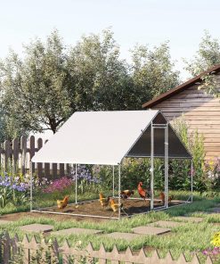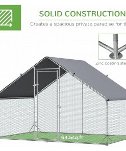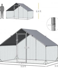 Small animals can enjoy space for play and exercise. This 9.8 Ft x 6.6 Ft. Outdoor Yard Metal Walk-in Chicken Coop with Waterproof Cover has a run that is suitable for 4-6 chickens, rabbits (if reinforced for digging), ducks, and more. And the ample space makes adults walk around comfortably. Lockable door with a latch makes this large chicken coop extra safety. And the chain link walling features steel wires and a sturdy galvanized steel frame that’s resistant to wear and rust, allows you to avoid worrying about small animals being intruded by predators at night. The metal wire is treated with a dipping process that ensures protection against injury. The shady roof with spring button clips helps your pet stay cool in the heat while avoiding dehydration and keeping them comfortable. The coverage of this chicken cage also protects them in case of rain showers. It’s made from specially treated Oxford cloth with water and UV resistance for survivability in bad weather. Offer your small pet a homier space with a place to stay roofed. This metal chicken pen offers walk-in height. Enter easily and comfortably through a door that locks when you’re done. Attach it to a wooden coop for an upgraded shelter. Overall Dimensions: 6.6′ L x 9.8′ W x 6.6′ H. The diameter of galvanized steel pipe: 1″ Tube Diameter. Assembly required.