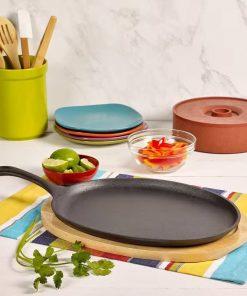 • WHAT’S IN THE BOX. Basic Essentials Pre-Seasoned Cast Iron 2-Piece 9.5 in. x 7 in. Oval Fajita Set with a 10.5 in. x 7.5 in. Oval Wood Trivet.