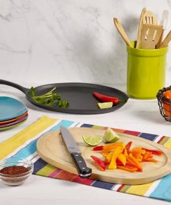 A good seasoning makes all the difference. We season this 9-inch Cast Iron Flat Skillet Frying Pan Griddle with 10.5-inch Oval Wood Trivet cookware with 100% pure cooking oil, no synthetic coatings or chemicals. The more you use your iron, the better the seasoning will get. Cast Iron is the right tool for anything. Go get your sear, saut, bake, broil, braise or fry on at home in the oven, on the stove, on the grill or over the campfire. Pre-seasoned for a natural and care free non-stick surface that only gets better with age- like a fine wine. WHATS IN THE BOX. Basic Essentials Pre-Seasoned Cast Iron 2-Piece 9.5 in. x 7 in. Oval Fajita Set with a 10.5 in. x 7.5 in. Oval Wood Trivet.