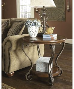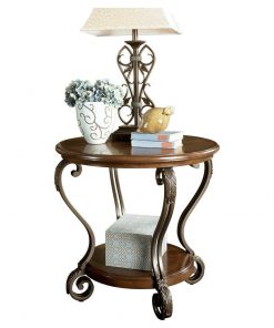 With the scrolling bronze color finished metal adorned with wirework detail supporting warm burnished finish table tops, this Accent End Table Nightstand in Brown Wood with Scrolling Metal Legs beautifully captures the elegance and grandeur of fine traditional design.