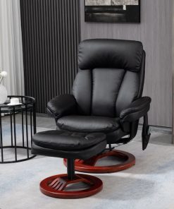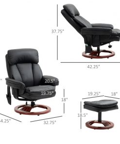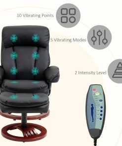 This Adjustable Black Faux Leather Electric Remote Massage Recliner Chair w/ Ottoman is beautifully designed with its sleek faux leather surface and round wood base without compromising comfort, ideal for having some pleasant downtime whether you are watching TV, reading a book, or having a rest. Sit back and relax with a max tilt angle of 135 degrees. The faux leather surface, thick padding, and an ottoman make this massaging chair the ultimately comfortable seat for any occasion. There are ten vibrating massage points in the back, lumbar, thighs, and legs. Available in 5 functional modes (pulse, press, wave, auto, normal) and 2 intensity levels (high and low). This small recliner with an ottoman comes with remote control, so you can start or stop the massage, changing the modes, functions, and area of massage, all with the touch of a button. A convenient pocket is on the side of the seat to store while not in use. Supported with a 360° swivel wood base and steel frame for enhanced stability, this recliners for small spaces with an ottoman is solid enough to withstand a weight of 330 lbs.