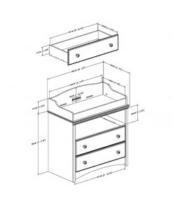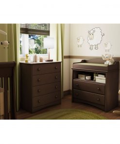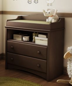 This Baby Furniture 2 Drawer Diaper Changing Table in Espresso is manufactured from eco-friendly, EPP-compliant laminated particle board carrying the Forest Stewardship Council (FSC) certification. Angel collection . 2 drawers . Secure front panel . Decorative kick plate . Smart glide drawer slides . Top of the changing table features rounded contours for added safety . Readily accessible open storage space . Manufactured from engineered wood products . Exceeds all US Consumer Product Safety Commission Standards and conforms to ASTM standards as well . Packaging is ISTA 3A-certified to ensure its integrity and your total satisfaction . Products is made of EPP certified panels (Environmentally Preferred Product) . Traditional style . Espresso finish . Assembly required . Adult assembly required . 5-Year limited warranty . 35.5 in. W x 19.5 in. D x 39.25 in. H This practical changing table offers total safety thanks to its rounded contours and front panel. It also has an open storage compartment ideal for keeping your essentials close at hand. Its two drawers fitted with attractive wood handles feature the “Smart Glide” system with integrated safety catch and soft-closing mechanism to prevent accidents. The changing table has been designed to match most espresso-finish cribs on the market today. Ensure your baby’s safety with this practical and fashionable collection. Each designed to offer maximum security, these items reflect the latest styling while allowing you to keep baby’s room neat and organized.