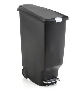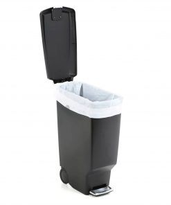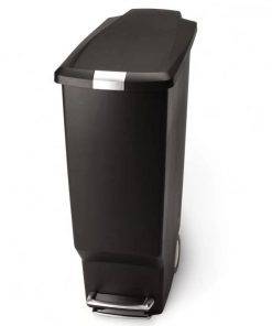 This Black 10-Gallon Narrow Kitchen Trash Can with Easy Step-on Lid can have a space-efficient shape that fits perfectly in tight spaces, like between cabinets. The strong steel pedal is designed to last, and our patented lid Shox technology ensures a smooth, silent close every time. A slide lock helps keep trash in and pets and curious children out. Our code k liner fits this can perfectly no bunching or slipping for a cleaner trash experience.