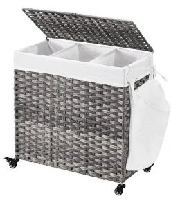 Make your laundry a breeze with this Black 3 Bin Linen Lined on Wheels PR Rattan Laundry Hamper. With a large capacity of 125L, this laundry basket provides ample space for clothes. The hamper is constructed with a sturdy steel frame and waterproof PE rattan to adapt to any conditions. Comes with 4 anti-slip foot pads to enhance the stability of the hamper. The lid on the top will avoid your clothes polluted by dirt and dust and protect your privacy as well. This laundry hamper comes with four universal wheels which allow you to move it smoothly anywhere you like. Comes with 2 detachable laundry cloth covers make sorting clothes easier and more convenient.