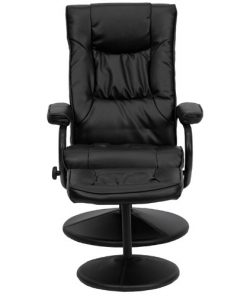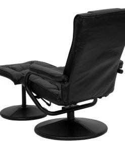 Recline in your favorite position with this Black Faux Leather Recliner Chair with Swivel Seat and Ottoman. This set features thickly padded arms and leather wrapped bases. This set is not only perfect in the home, but makes for a great addition in the office when you need to relax for a bit. The durable leather upholstery allows for easy cleaning and regular care.