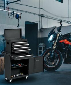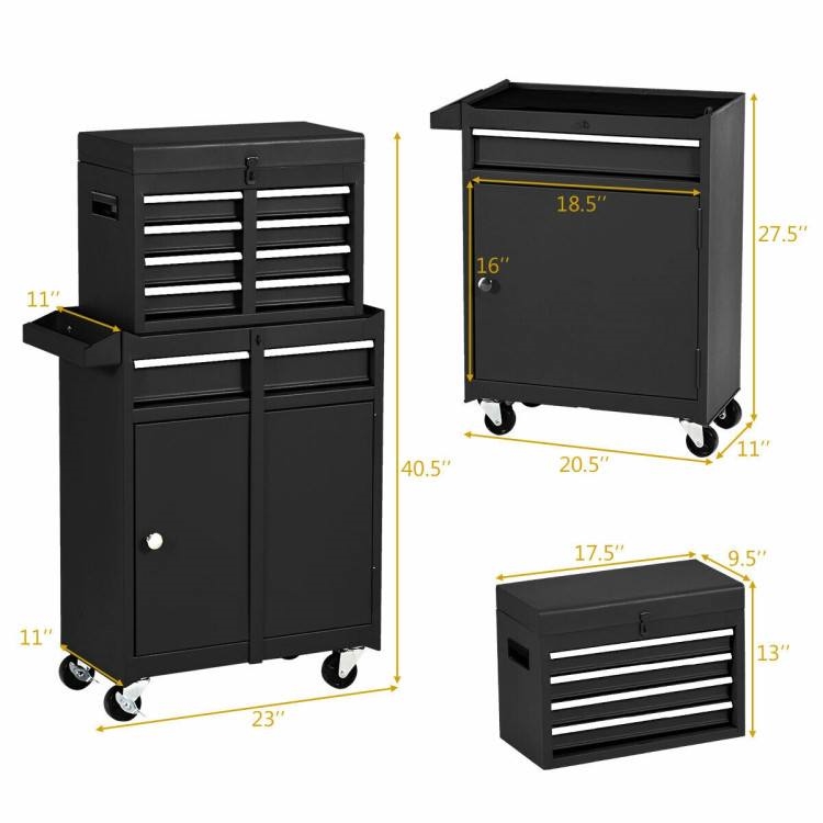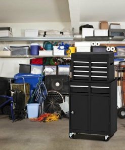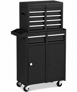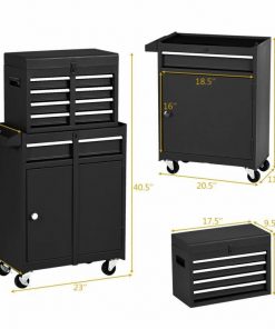 This Heavy Duty Steel Lockable Rolling Garage Tool Chest Storage Box has 5 drawers, 2 trays, a large bottom cabinet and a top box drawer, each drawer carrying 11 pounds with a total carrying capacity of that is 220 pounds. This cabinet can also be detached into 2 boxes, to be used separately making it a perfect addition to any garage or gear junkie! The body of this tool combination box is made of solid and durable steel, and the wheel is made of rubber-plastic synthetic material. High quality material selection and solid workmanship make the box structure strong, wear-resistant and durable. It has a long service life. This cart is equipped with drawer lock rod, which can be used to prevent the drawer from sliding out and lock the tool box (small lock are not included). In addition, the padding inside drawers and the padding at the top of lower box are EVA, which has good cushioning, seismic, heat insulation and other functions, and can effectively protect tools. This tool combination box has flexible and ingenious wheel design. This toolkits has four universal wheels which can rotate 360 degrees, and two of them have braking function.