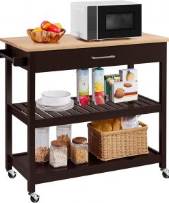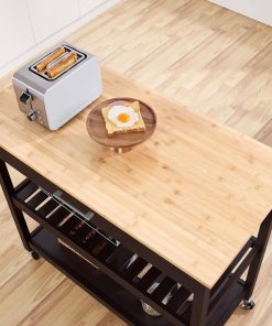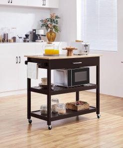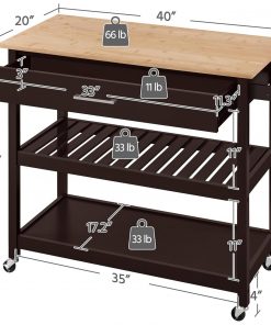 • Black Kitchen Island Cart with Wood Top 2 Shelves 2 Drawers and Locking Wheels