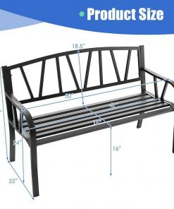 Enjoy outdoor leisure time with your beloved one by sitting on this Black Metal 2-Person Outdoor Garden Bench with Armrest – 660 lbs. Max Weight! Made of sturdy metal frame, this Black Metal 2-Person Outdoor Garden Bench with Armrest – 660 lbs. Max Weight is stable and large enough to accommodate 2 people sitting at the same time. What’s more, the curved armrests and seat as well as the 105° ergonomic angle will make you feel comfortable while sitting on this metal bench. And the slatted design not only facilitates water drainage but ensures a breathable sitting experience. In addition, the simple style and black color add a modern addition to your porch, garden or backyard.