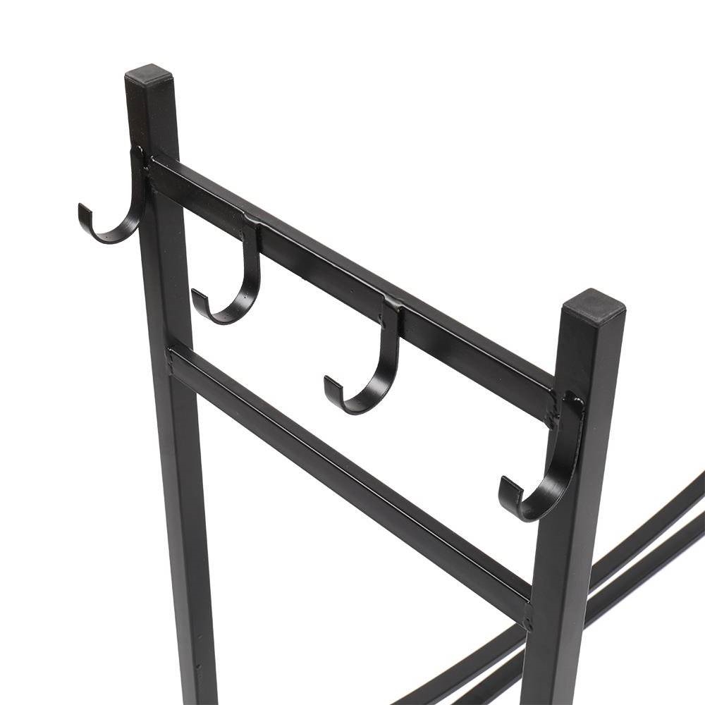This Black Metal Firewood Holder Log Rack with Poker Shovel Tongs and Broom is made from powder-coated galvanized tubular steel.It provides shelter and protects seasoned firewood by keeping it off the ground.It can hold large amounts of wood while also resisting the effects of the weather, so you can store it either indoors or outdoors as needed. Classical black will match your decor in modern style. What are you still hesitating? Hurry up and place an order.