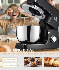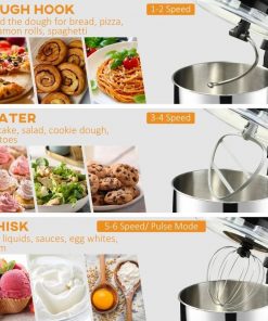 This Black Stainless Steel Tilt 600W Electric Mixer 6QT is designed with a high-performance 600W pure copper motor and multiple speed choice to more effectively knead dough and beat eggs, this food mixer provides versatility for frosting, creamy dressings, dough, and baked goods. This standing mixer has a 6-level speed ranging from low to high, providing options to knead gently and thoroughly mix,. Press the ‘P’ button to mix at the fastest speed in a short time. This stand mixer’s 6qt mixing bowl lets you make two dozen cookies or four loaves of bread in a single batch. It also includes a dough hook, beater, and whisk to expand your culinary options. The tilt-head design allows less mess when changing out accessories. The suction cups under the bottom provide excellent stability. NOTE: Don’t forget to put the bowl cover on top before turning it on.