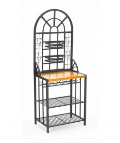 This Black Steel Bakers Rack with Utility Hooks and Storage Shelving adds functional storage and display space. Get creative and arrange plants or spices in the two stylish adjustable basket shelves. Six utility hooks are included that can be moved around and used for anything that you can imagine. Constructed of solid tubular steel and covered in a durable black finish, this contemporary baker’s rack is as durable as it is versatile. The golden oak workspace is laminated to give the appearance of a solid butcher-block countertop. Hidden under the counter, a rack for five bottles of wine and two full-sized wire shelves creates ample storage for plates, bowls, and jars. Expand your storage options by adding this creative baker’s rack to your kitchen today.