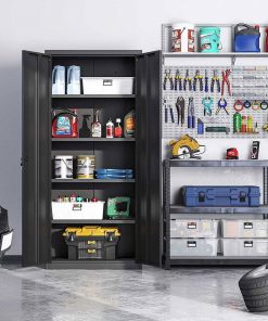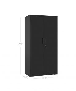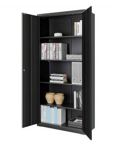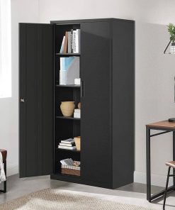 This Black Steel Lockable Storage Cabinet w/ 4 Adjustable Shelves offers versatility in the garage or workshop for garden tools and sports equipment, in the laundry room for linens and soaps, or in the kitchen for canned food and cups! Limited office space but want a larger storage capacity? Comes with a lock and 2 keys to keep confidential documents safe. Standing at 31.5”L x 15.7”W x 70.9”H, this office cabinet provides 5 storage shelves to keep your office supplies as neat as a pin while taking up minimum floor space. Steel construction can support up to 55 lbs. for each shelf and withstand the test of time. 4 adjustable shelves help you keep things in order ‒ everything from small to bulky items, while saving your time looking for paperwork; the metal lock and 2 keys keep your old letters and fancy pens safe.
