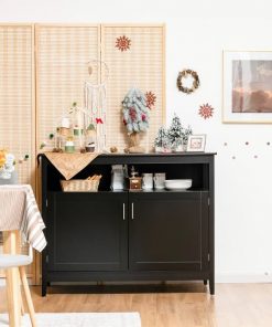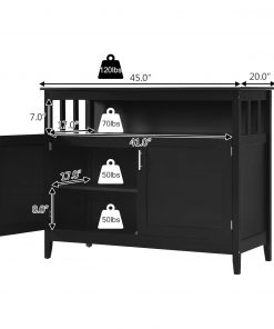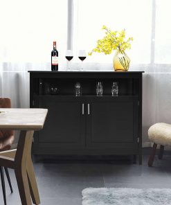 Constructed by natural pine wood and MDF board, this Black Wood 2-Door Dining Buffet Sideboard Cabinet with Open Storage Shelf is solid and durable. The medium density fiberboard won’t be affected with dampness and won’t deform like normal wood after years of use. Set proper items as you like on the top surface. An open shelf can hold baskets of essentials or display items. While the large two doors can be opened and there are two layers available for convenient storage. All the boards and hardware are included. Instruction is also included for easy installation. Proper size for side ends and coffee tables in your kitchen. Create your own casual yet sophisticated storage, enjoy extra storage in your kitchen with this cabinet. We stand behind our products with our Satisfaction Guarantee. We not only offer qualified products with favorable prices to our customers but also great customer service.