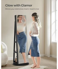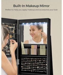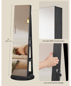 This Black Wood Jewelry Cabinet Armoire Organizer Freestanding Rotating Mirror comes with a 14.6″ x 61″ frameless, full-length mirror thats easy on the eyes and gives you a head-to-toe reflection, making your daily outfit checks more enjoyable. 120 earring slots, 54 stud earring holes, 18 necklace hooks,104 ring slots, 3 bracelet rodsthe jewelry jungle ends here. Plus, there are 3 compartments, 2 drawers, 4 shelves, and a bag for your makeup! 6 LED lights illuminate your jewelry when you open the door of this jewelry organizer, allowing you to pick out the right accessories easily without waking your beloved one with ceiling lights. A built-in mirror and a flip-over shelf as a counter for your makeup create a mini vanity table, allowing you to apply makeup and accessorize your look without closing the cabinet door. The large 21.5″ Dia. round base and quality MDF of this jewelry armoire ensure stability while its velvet lining protects your jewelry from scratchesyour bling will remain intact for years to come. This jewelry mirror cabinet rotates 360 degrees to allow you to access what you need easily from the 3 shelves on the back, and hide them out of sight when not in use. Who doesn’t want flexibility like that? This jewelry armoire with a mirror comes nearly completely pre-assembledall that’s left is to attach the base and then add the shelves on the back of the cabinet. Following the clear instructions step by step, you’ll have this mirror cabinet ready in a jiffy. If you want to keep your valuables safe and out of reach, this mirror jewelry cabinet ticks your boxes. 2 keys allow you to lock your cherished bling away, so no little hands get in.