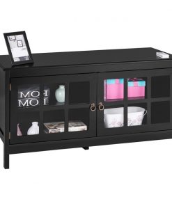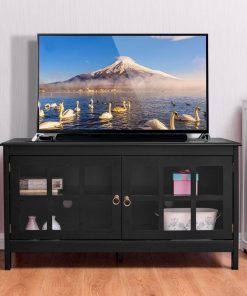 This Black Wood TV Stand with Glass Panel Doors for up to 50-inch TV brings a dramatic contemporary styling to your home with its elegant finish. The top can support TVs up to 50 inches, and the 4 shelves help you storage necessary media or gaming devices. This TV stand is more than a TV stand, it is a piece of furniture for your home. With a clean-edged top, rectangular legs, delicate glass, and classic circular handles, our distinctive TV stand creates a warm and charming atmosphere for your home or office. This TV stand is designed to blend into a variety of living and family room settings. With its casual contemporary style, this exquisite collection is a relaxed look that fits anywhere. Do you want this beautiful TV stand? just buy it now!