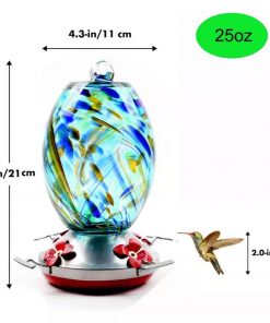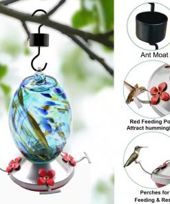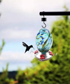 This Blue Blown Glass Hummingbird Feeder with Perch and 4 Feeding Ports are designed to attract the elusive hummingbird into your own backyard. Its attractive colored blown-glass design along with its eye-catching design is sure to make birds flock into your backyard. A special type of hanger S hook is also included to allow you to hang it on your porch. 1. Made of high quality, thick, hand blown glass 2. One S hook included that can be secured with any plant hanger or wire/rope from a tree that will hold the hummingbird feeder in place through wind storms.