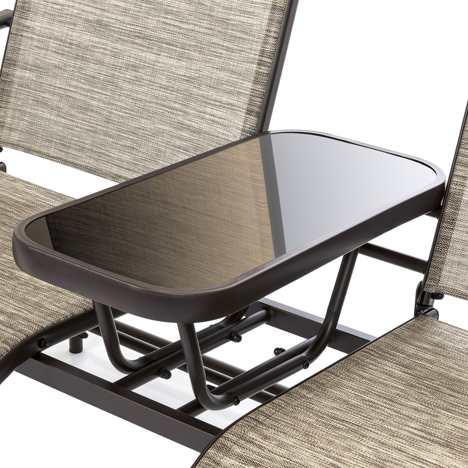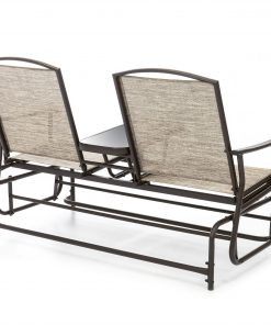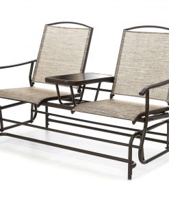 Relax and sip the night away at home in style with the Brown 2-Seater Outdoor Mesh Double Glider Tempered Glass Attached Center Table. Perfect for afternoon lounging or a relaxing date, built with an elevated tempered glass center table for snacks and beverages. Combination of mesh fabric on a sturdy steel frame for maximum durability through the years. For stability with style, the seat frame connects to 4 rocker arms to easily glide front to back. Designed with armrests and a high back for substantial support and comfort