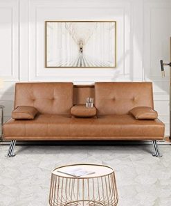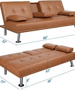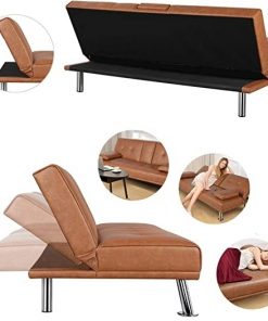 This Brown Modern Faux Leather Cup Holders Click Clack Convertible Sofa Bed Futon Sleeper is made from high quality artificial leather, steel, polyurethane and Plywood material. This sofa has 3 convertible positions for sitting, lounging and sleeping, so it can be a comfy sofa for daily use or a temporary bed for guests. This Brown Modern Faux Leather Click Clack Convertible Sofa Bed Futon Sleeper is designed for entertainment. The middle arm rest folds down with 2 cup holders, so you and your friend can relax and enjoy a couple of beverages. Comes with 4 detachable metal legs for extra support.