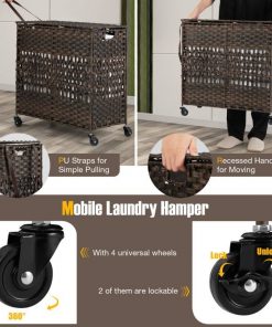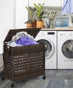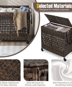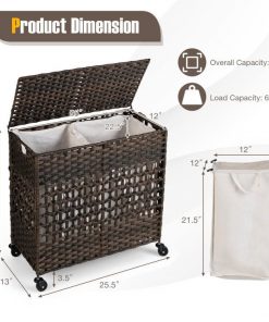 Make laundry day a breeze with this Brown Rattan 2 Section Rolling Wheeled Laundry Hamper with Removeable Bags! Features a wide inner space to provide a large capacity, which is ample for daily needs of storing dirty clothes or kids toys. Comes with a flip-up lid, which is convenient to open and close, intending to hide the unpleasant smell as well as annoying chaos. Contains 2 separate liner bags that are machine washable. Exterior surface is composed of PE rattan, which presents great water resistance and fade resistance. Plus, the steel structure is reinforced, so the laundry hamper features a strong load capacity and is not easily deformed. Overall, it is a perfect hamper for long-time home use requiring easy maintenance.