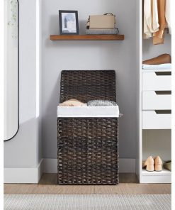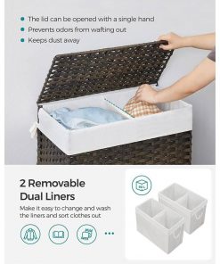 - Brown PP Rattan 24-Gal Laundry Hamper Basket w/ 2-Compartment Washable Liner Bag