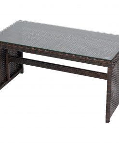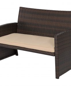 Add style and class to your patio, poolside area, or outdoor garden with this Brown Resin Wicker 4-Piece Modern Patio Furniture Set with Beige Padded Cushions. Complete with seat cushions, it includes a double sofa, two single sofas, and a table with tempered glass. The sturdy steel frame and wicker make it durable and able to hold up to 300 lbs. The comfortable sponge padded cushions (included with each seat) feature removable polyester covers that allow for easy cleaning and maintenance. Their tan color complements the brown medley of the wicker frame. The table features a removable tempered glass that adds a sophisticated touch and allows you to place drinks, meals, or decorative items on top of it.
