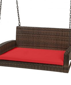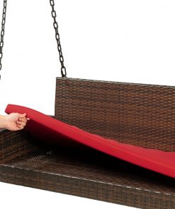 Swing into summer with the Brown Wicker Hanging Patio Porch Swing Bench w/ Mounting Chains and Red Seat Cushion. A sturdy powder-coated steel frame is overlayed with a tight all-weather wicker weave and topped off with a red weather-resistant cushion. An extra-wide seat is perfectly balanced to support you and your favorite guest with a 550-pound weight capacity. Tempered-steel chain links are chemically dipped and electrically bonded with a anti-corrosion solution to prevent weathering.