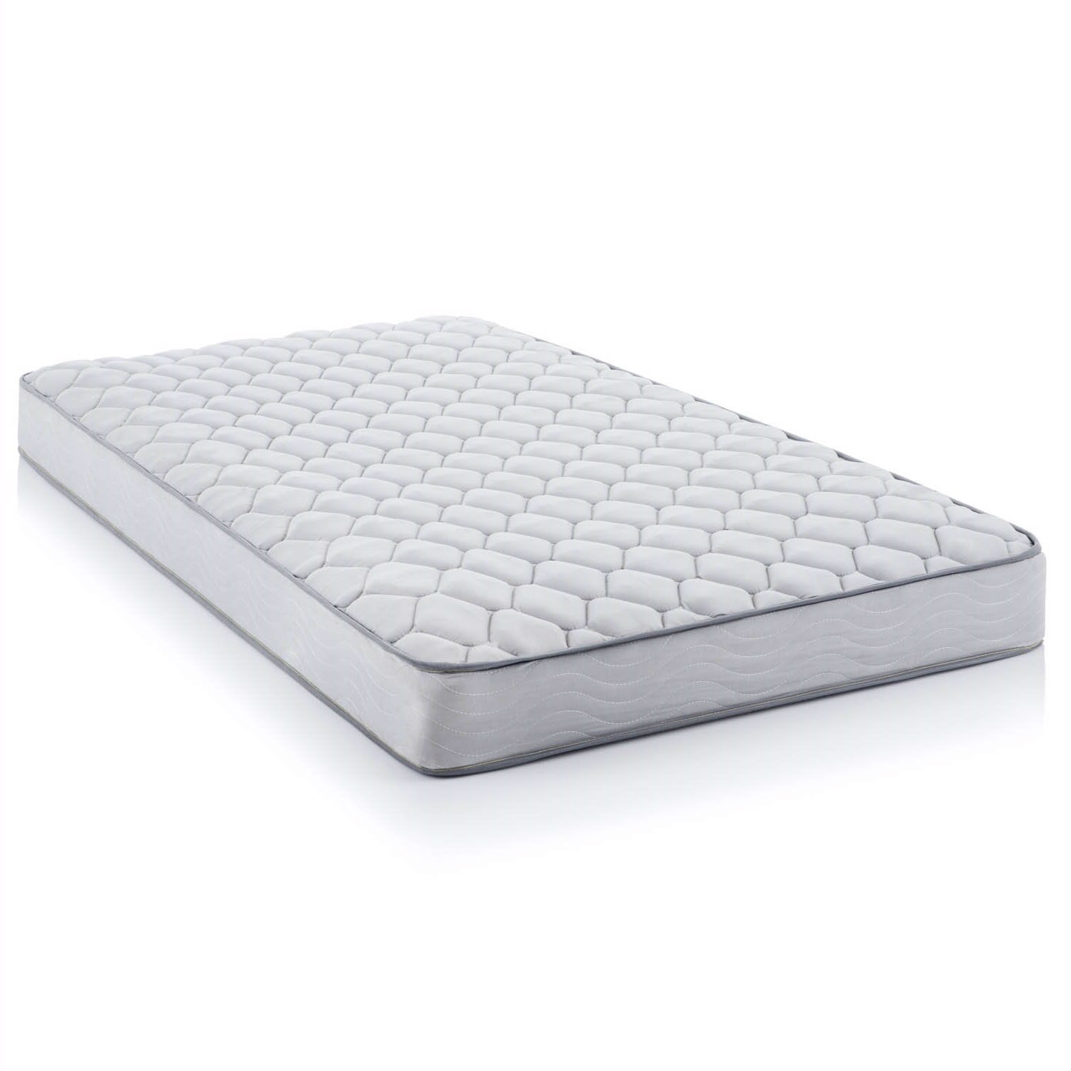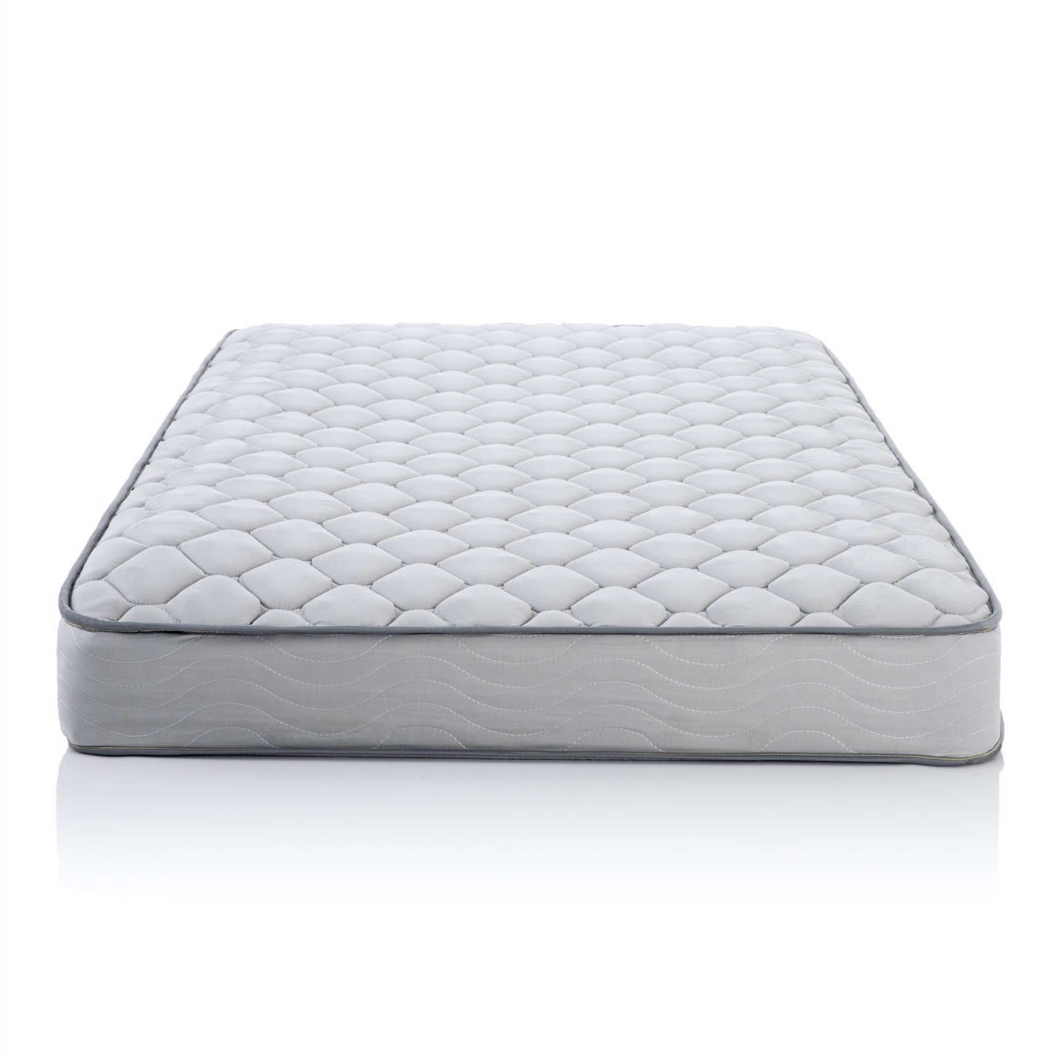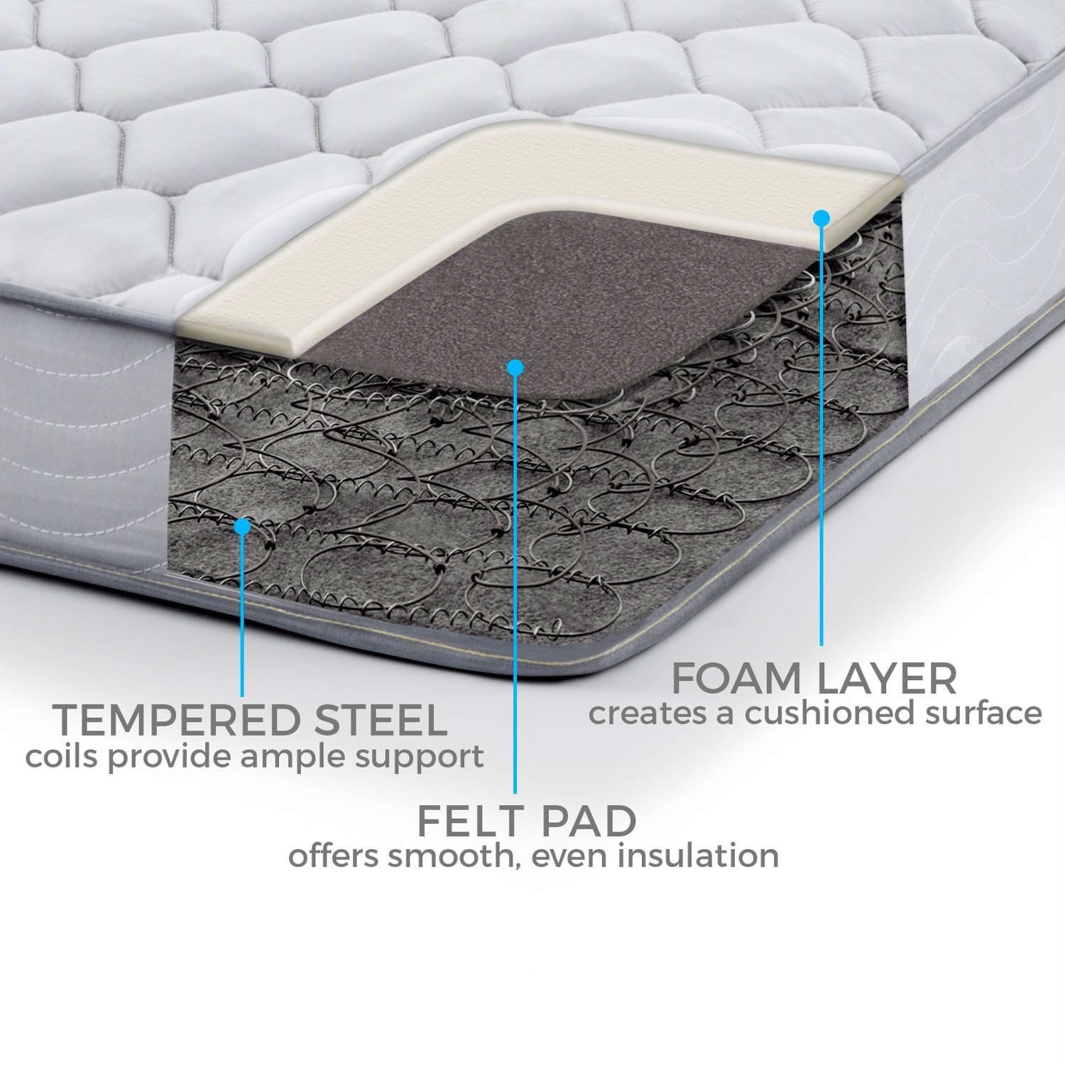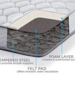 Quilted fabric cover and foam layer above the coils offers a layer of cushioning at the surface for more comfort