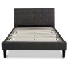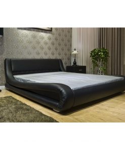 You will love the sleek curvature and contemporary design of this California King Modern Black Faux Leather Upholstered Platform Bed. Covered in man-made leather, this bed comes with slats so there is no need of a bunkey board or spring box when adding this bold piece to your room. The bed is around 95″(L)*84″(W)*30″(H) bedding and mattress are not included. Finish: Black.