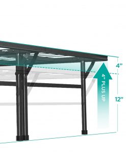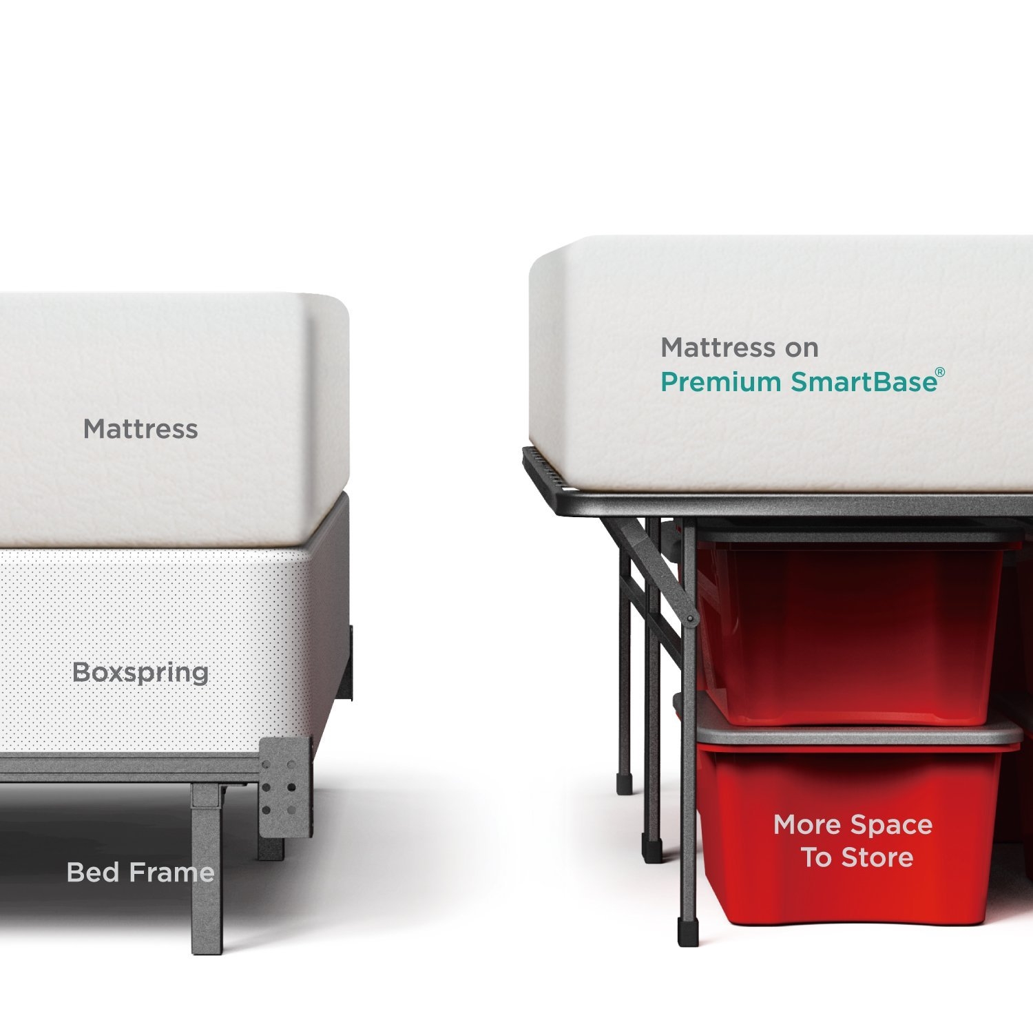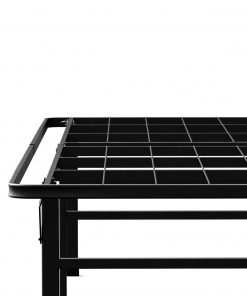 This California King size 18-inch High Rise Metal Platform Bed Frame with Under Bed Storage Space eliminates the need for a box spring as your memory foam, spring or latex mattress should be placed directly on the Base. The base works especially well for lower profile 6, 8 and 10 inch mattresses, giving your bed a lift for extra storage as well as ease of use. Uniquely designed for optimum support and durability the strong steel mattress support has multiple points of contact with the floor for stability and prevents mattress sagging, increasing mattress life. The California King size 18-inch High Rise Metal Platform Bed Frame with Under Bed Storage Space is 18 Inches high with 17 Inches of clearance under the frame for 4 extra Inches of under-bed storage space. With plastic caps to protect your floors and an innovative folding design to allow for easy storage, the Base is well designed for ease of use. Worry free 5-year limited warranty.
