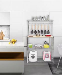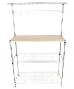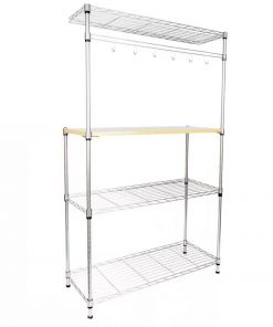 - Carbon Steel Kitchen Bakers Rack with MDF Wood Shelf and Hanging Bar with Hooks