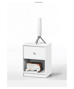 This Contemporary 1-Drawer Nightstand with Storage Shelf in White would be a great addition to your home. It has a contemporary style and is made of PEFC certified sustainable wood.